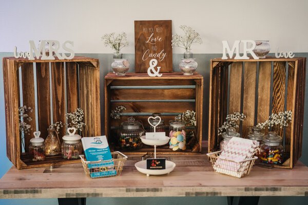 Mit den Holzkisten präsentiere ich euch eine besonders stilvolle und rustikale Variante der Candy-Bar. Die natürlichen Materialen verleihen eurer Feier eine warme, gemütliche Atmosphäre und setzen eure süßen Leckerrein liebevoll in Szene.